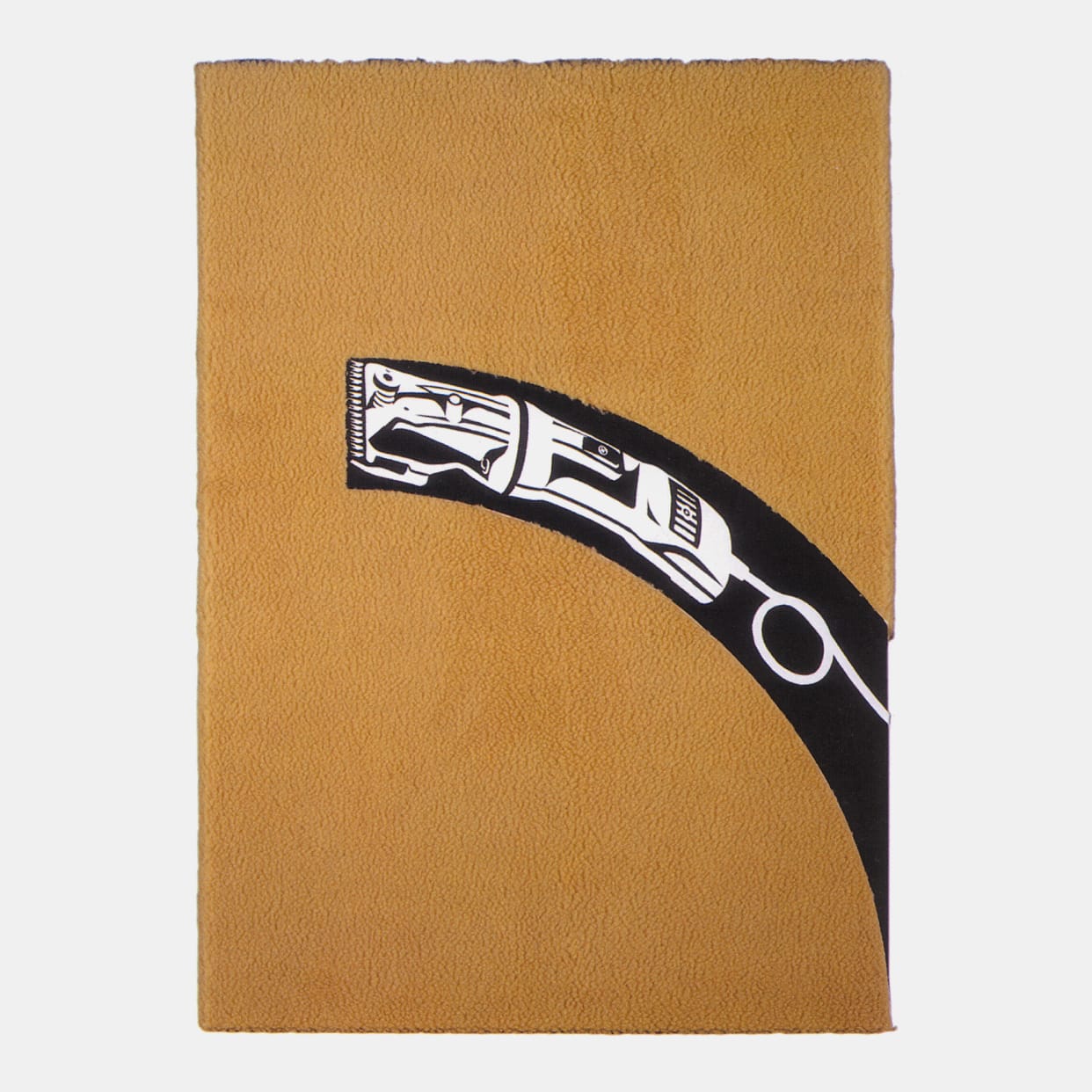 キャンバスを包みこんだ羊毛はフェイクウール、バリカンはフェイクレザー、皮膚は布地を用いて、生物から得られる衣服の素材とファッションとの関わりをユーモラスにデザイン。